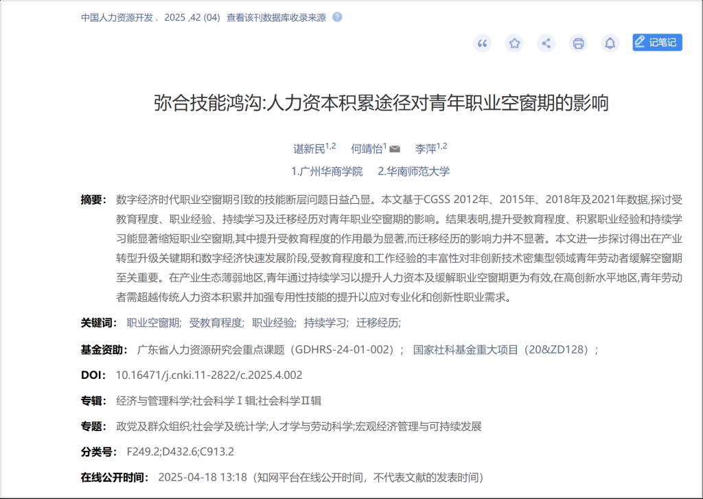 2025年4月,粤港澳大湾区研究院谌新民教授、何靖怡老师、李萍教授(客座教授)共同撰写的论文“弥合技能鸿沟:人力资本积累途径对青年职业空窗期的影响”在《中国人力资源开发》发表。《中国人力资源开发》创办于1984年,是国家发展和改革委员会主管、中国人力资源开发研究会主办的专业刊物,为国内人力资源专业领域内唯一的国家级核心期刊,在我国人力资源开发领域、人力资源职业化建设的前沿具有十足权威与影响力。